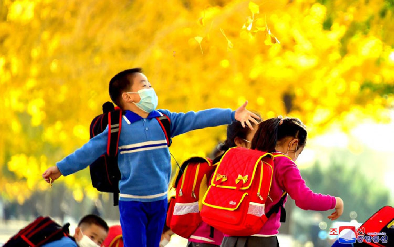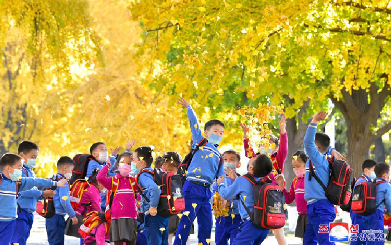 Laughter of happiness fill the autumn-tinted street