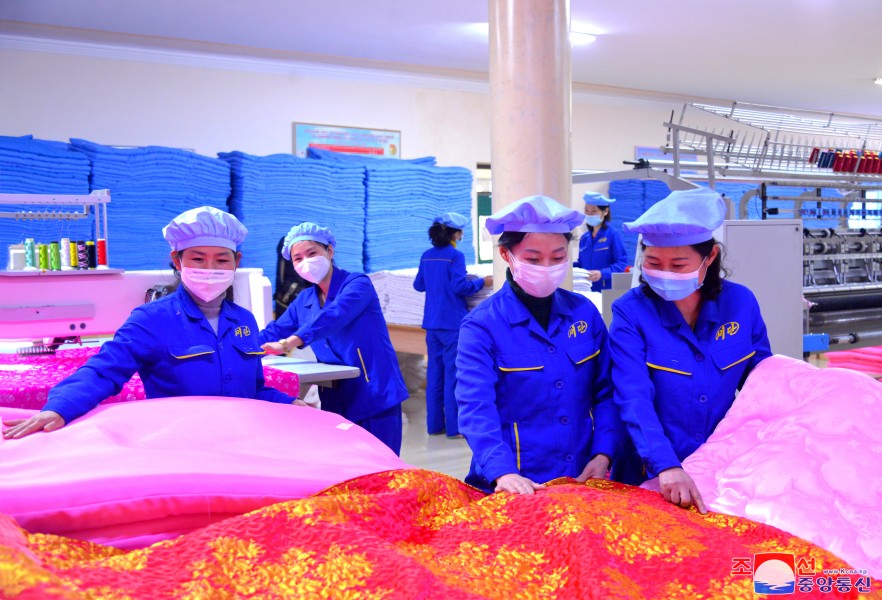 The pictures show the production site of silk bedding at Pyongyang Kim Jong Suk Silk Mill.